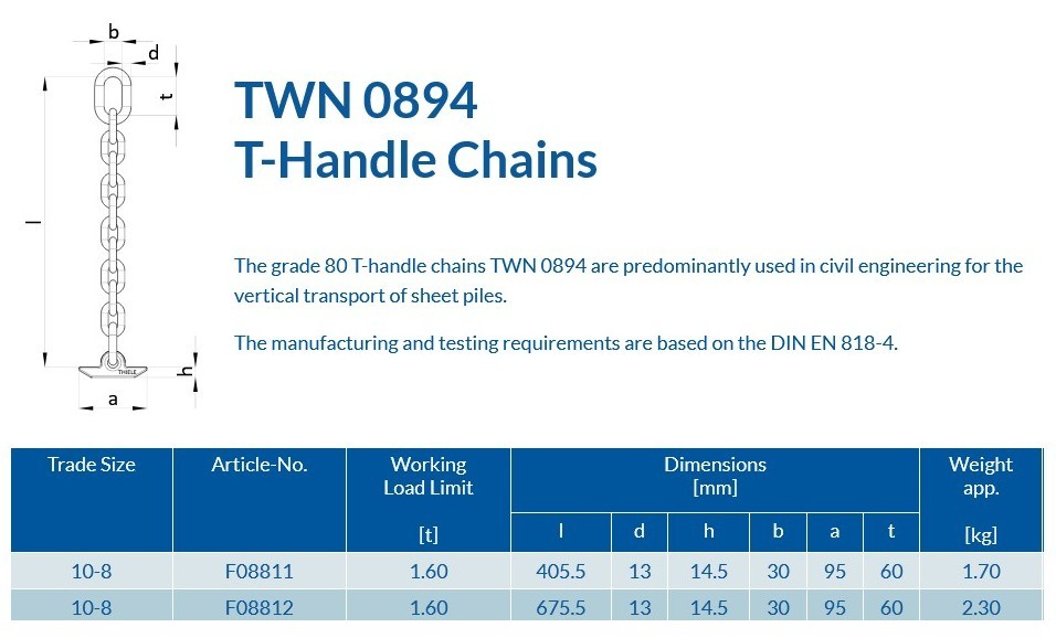 The grade 80 T-handle chains TWN 0894 are predominantly used in civil engineering for the vertical transport of sheet piles.