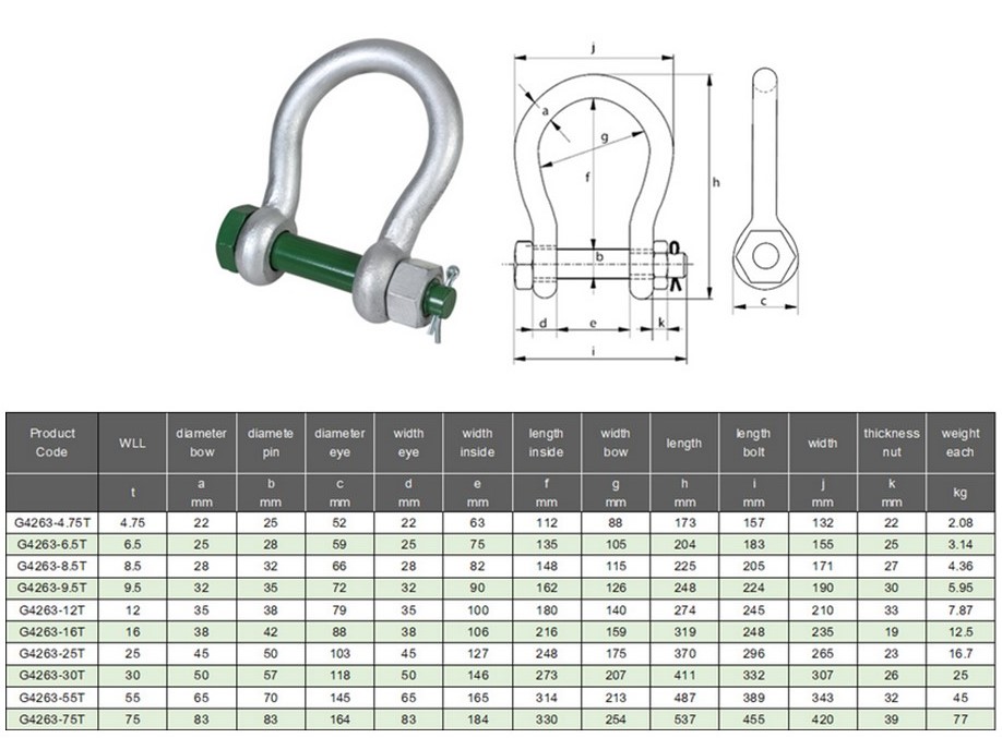 | Size / Rating | 12.0T WLL – 38mm Pin – 100mm IW, 4.75T WLL – 25mm Pin – 63mm IW, 6.50T WLL – 28mm Pin – 75mm IW, 8.50T WLL – 32mm Pin – 82mm IW, 9.50T WLL – 35mm Pin – 90mm IW |