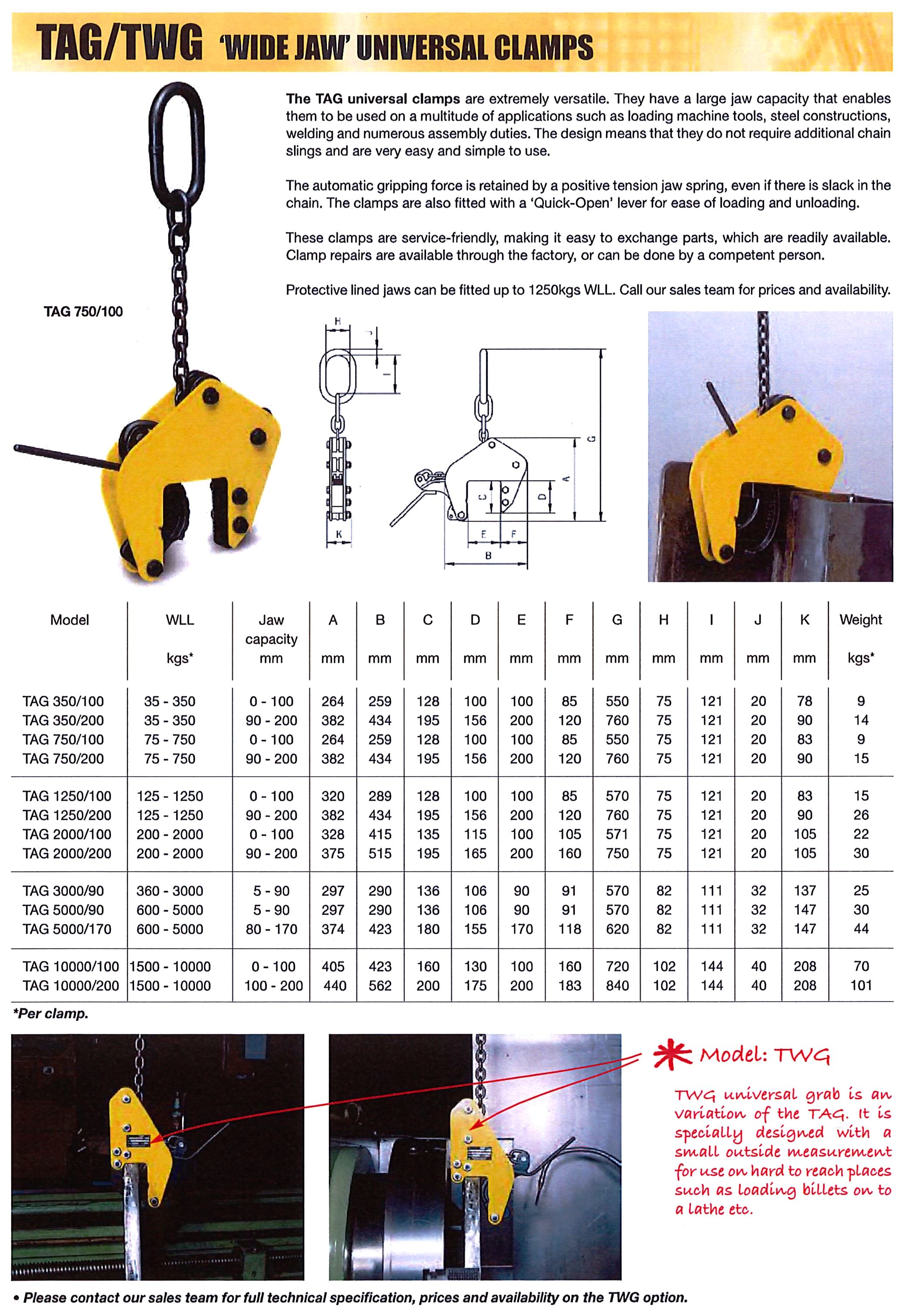 | Clamp Size | 0.75T WLL / 0-100mm, 1.25T WLL / 0-100mm, 2.0T WLL / 0-100mm, 3.0T WLL / 5-90mm, 5.0T WLL / 5-90mm |