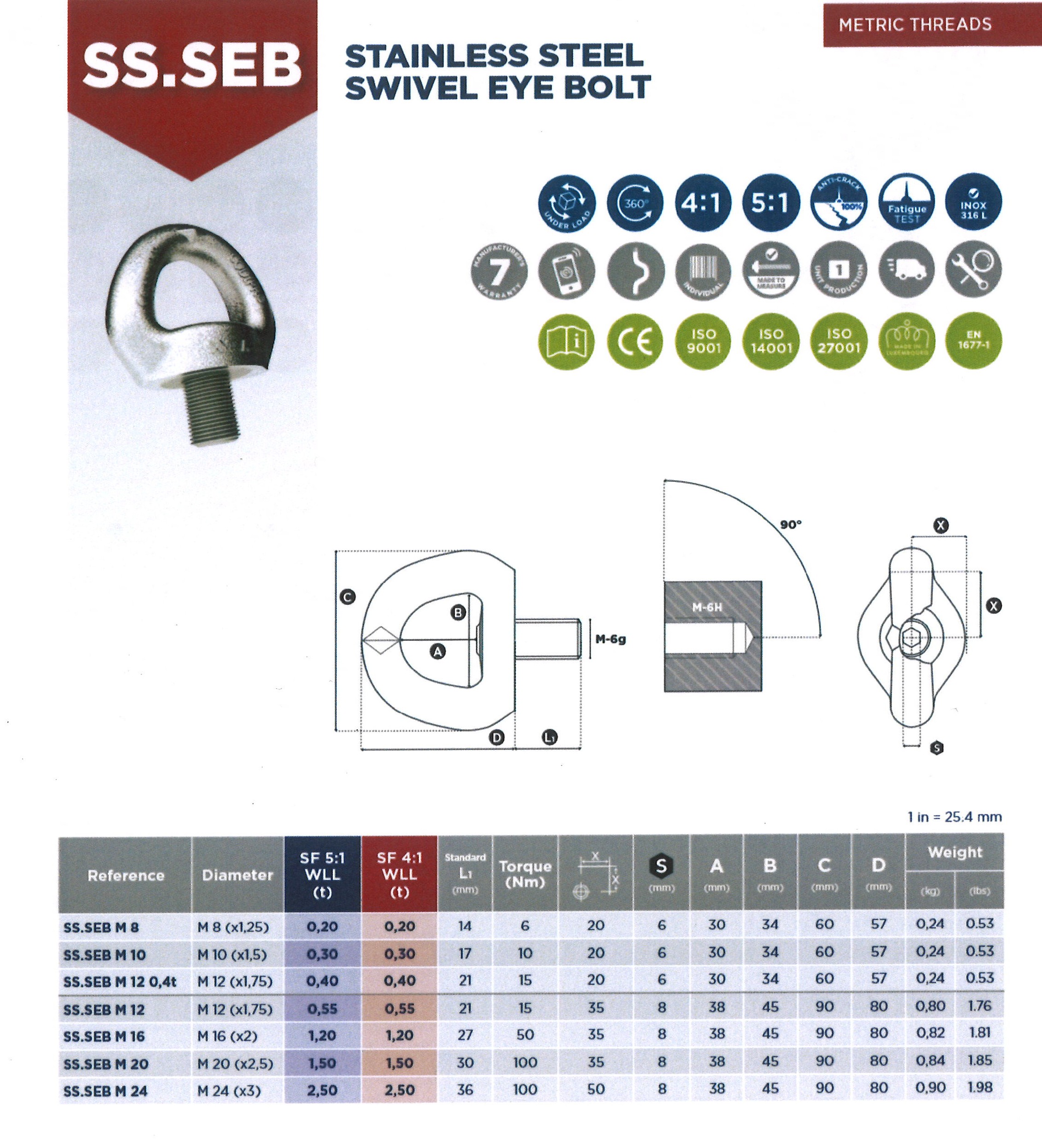 | Size / Rating | M10 0.30T (300KG) WLL, M12 0.55T (550KG) WLL, M16 1.20T (1,200KG) WLL, M20 1.50T (1,500KG) WLL, M24 2.5T (2,500KG) WLL, M8 0.20T (200KG) WLL |