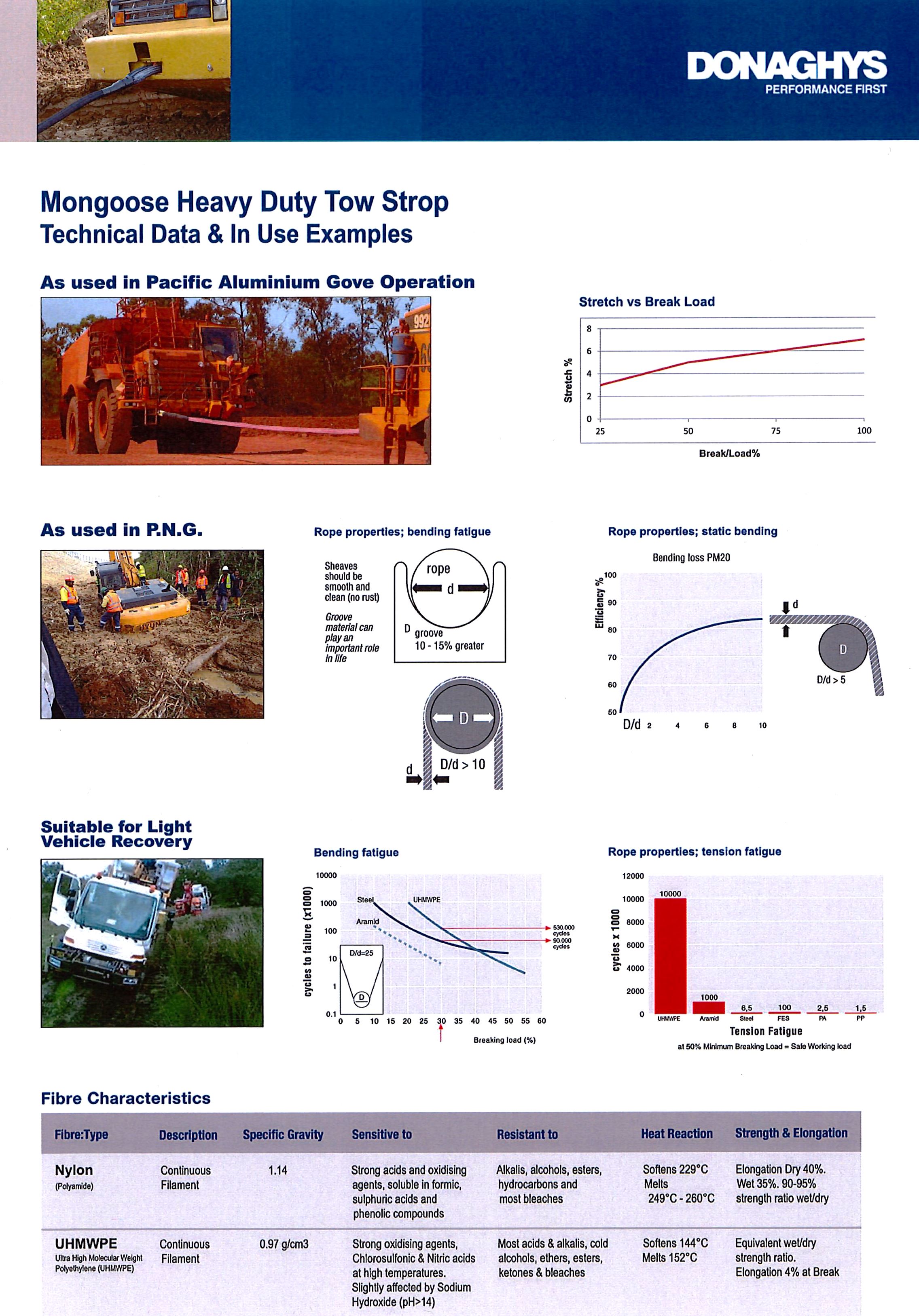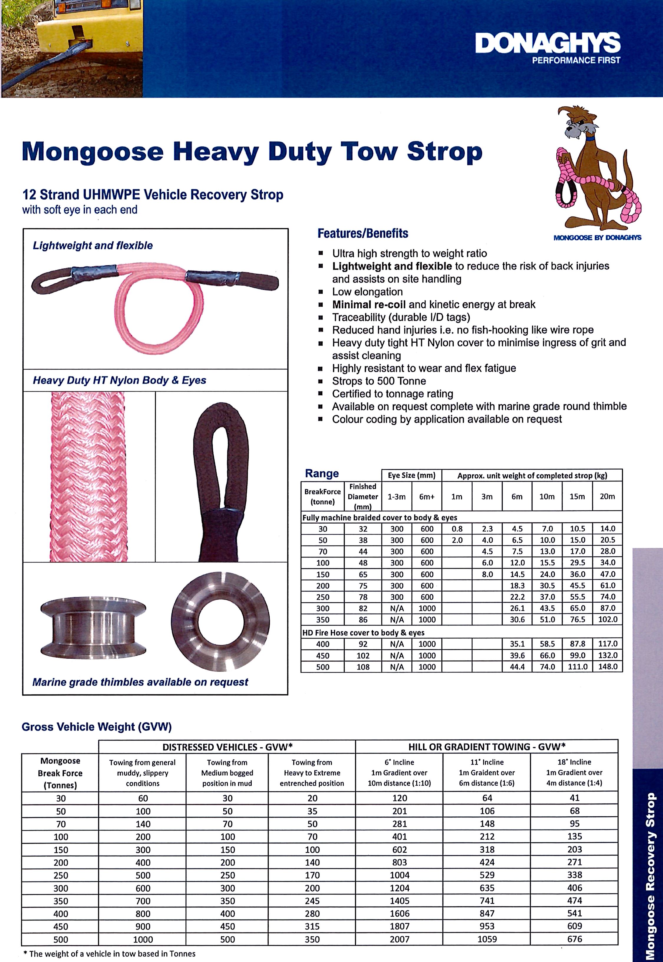 Donaghys’ Mongoose Heavy Duty Tow Strop is a 12 strand UHMwPE tow rope designed for industrial and light vehicle and 4×4 vehicle recovery. The Mongoose vehicle recovery strop has an ultra high strength to weight ratio and is lightweight and flexible to reduce injuries and assist on site handling on your work site.