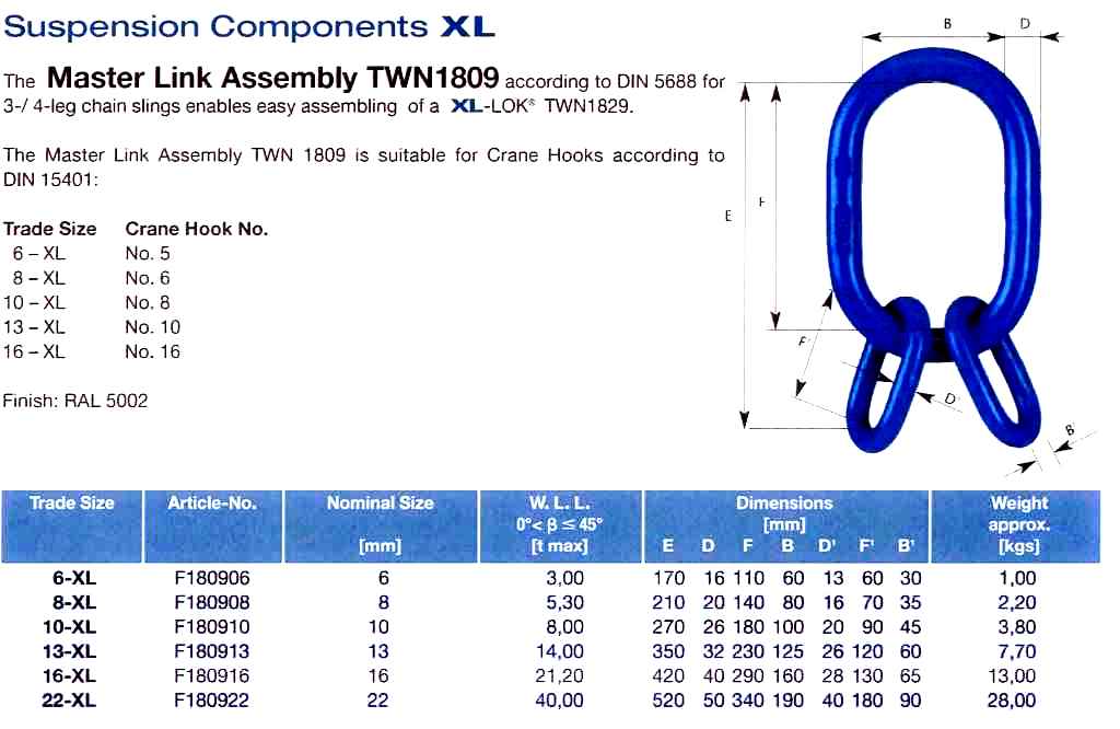 | Size / Rating | 10mm 3-4Leg 8.0T @ 90Deg, 13mm 3-4Leg 14.0T @ 90Deg, 16mm 3-4Leg 21.2T @ 90Deg, 22mm 3-4Leg 40.0T @ 90Deg, 8mm 3-4Leg 6.0T @ 90Deg |
