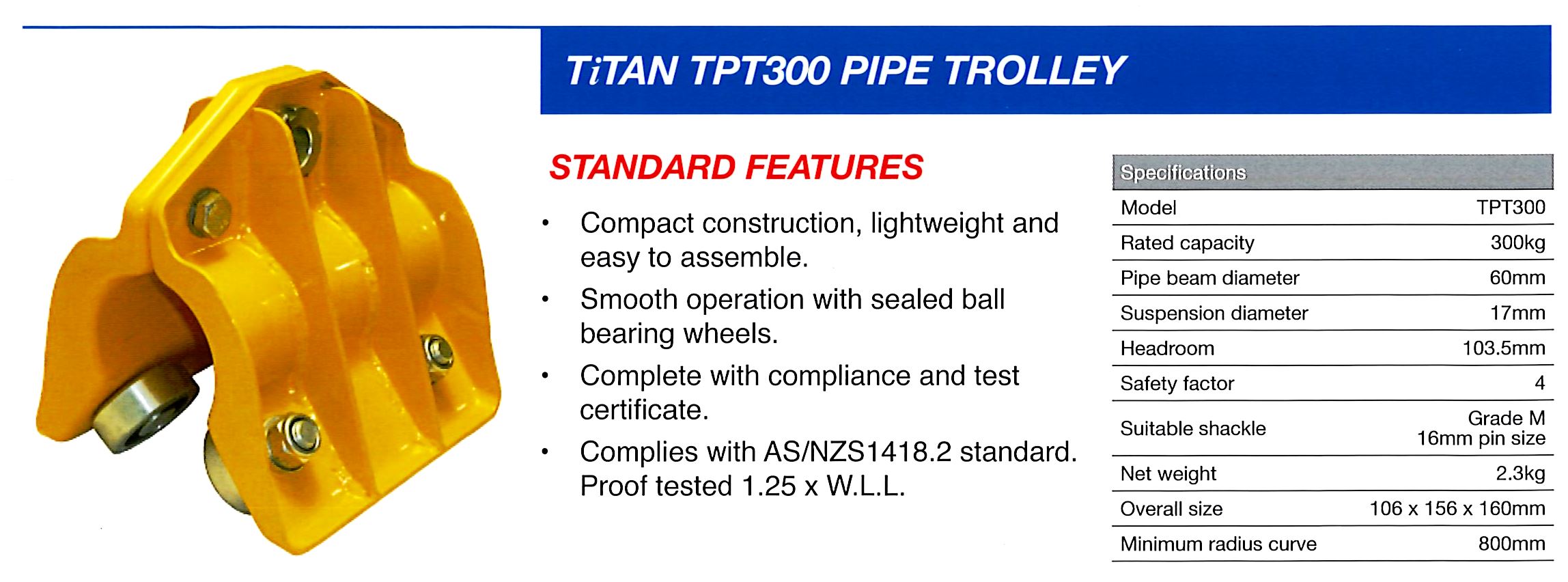 The Titan Pipe Trolley is designed for handling/hoisting equipment and moving heavy objects on a pipe beam that is lightweight and widely available.