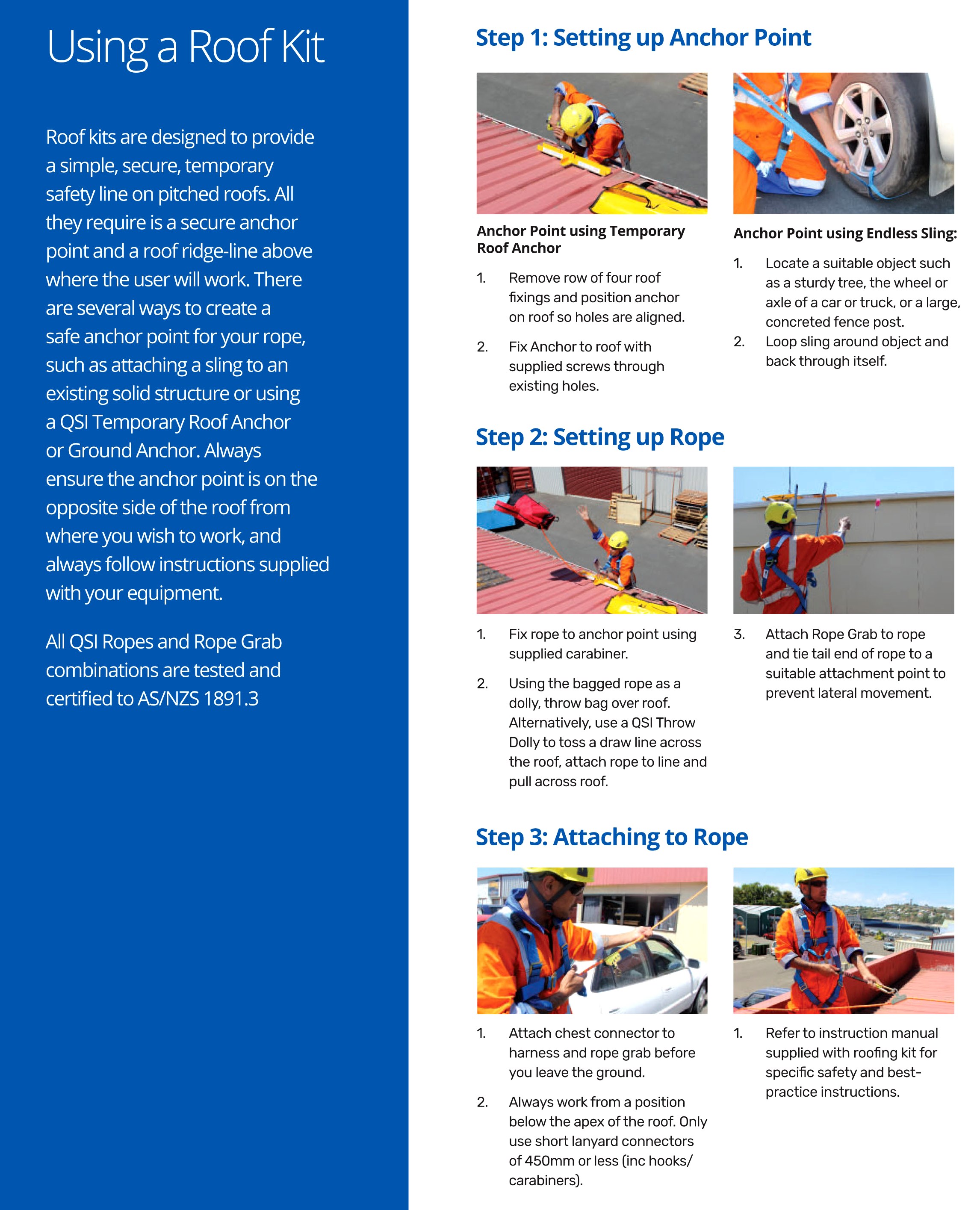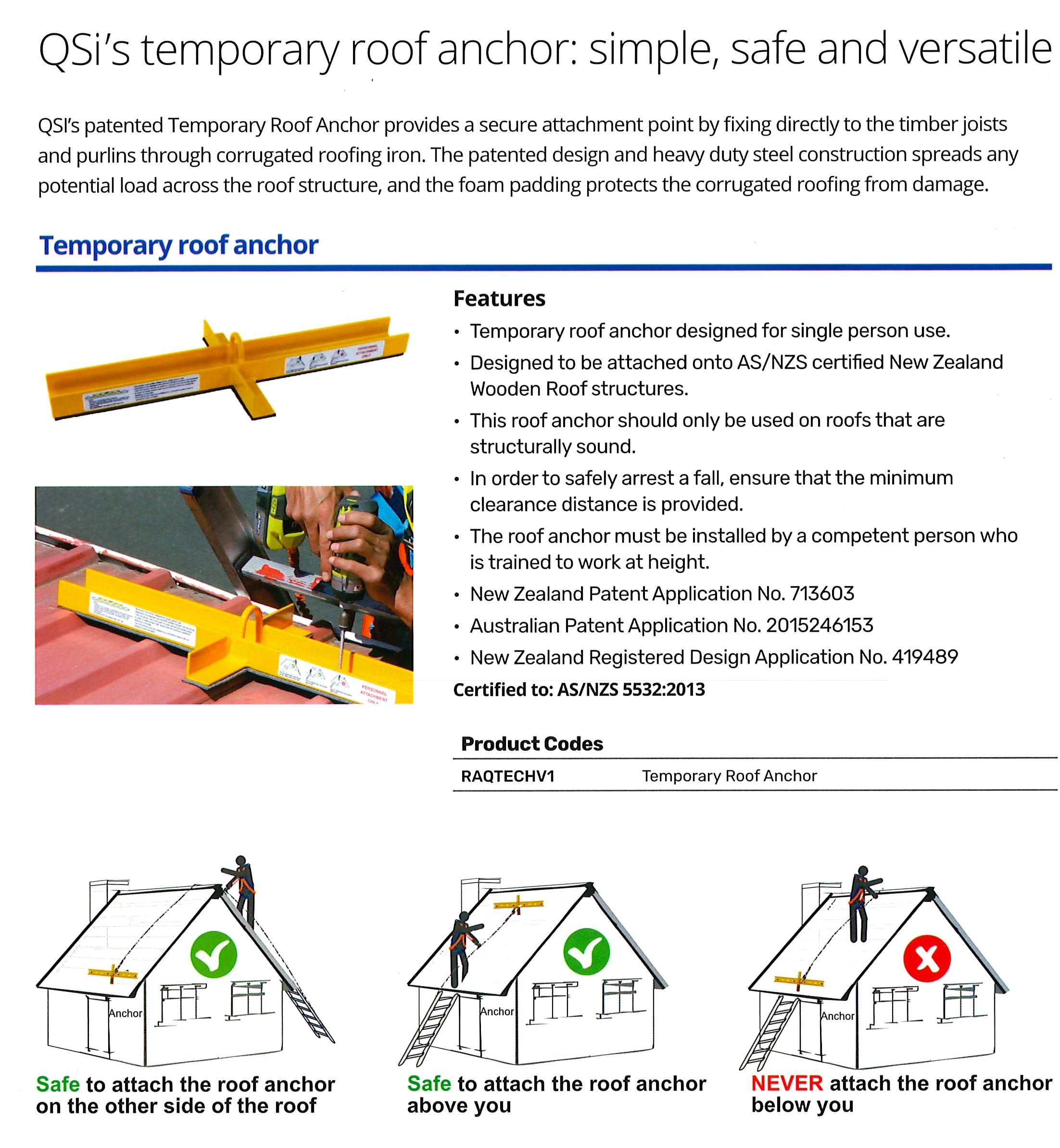 QSI’s patented Temporary Roof Anchor provides a secure attachment point by fixing directly to the timber joists and purlins through corrugated roofing iron. The patented design and heavy duty steel construction spreads any potential load across the roof structure, and the foam padding protects the corrugated roofing from damage.