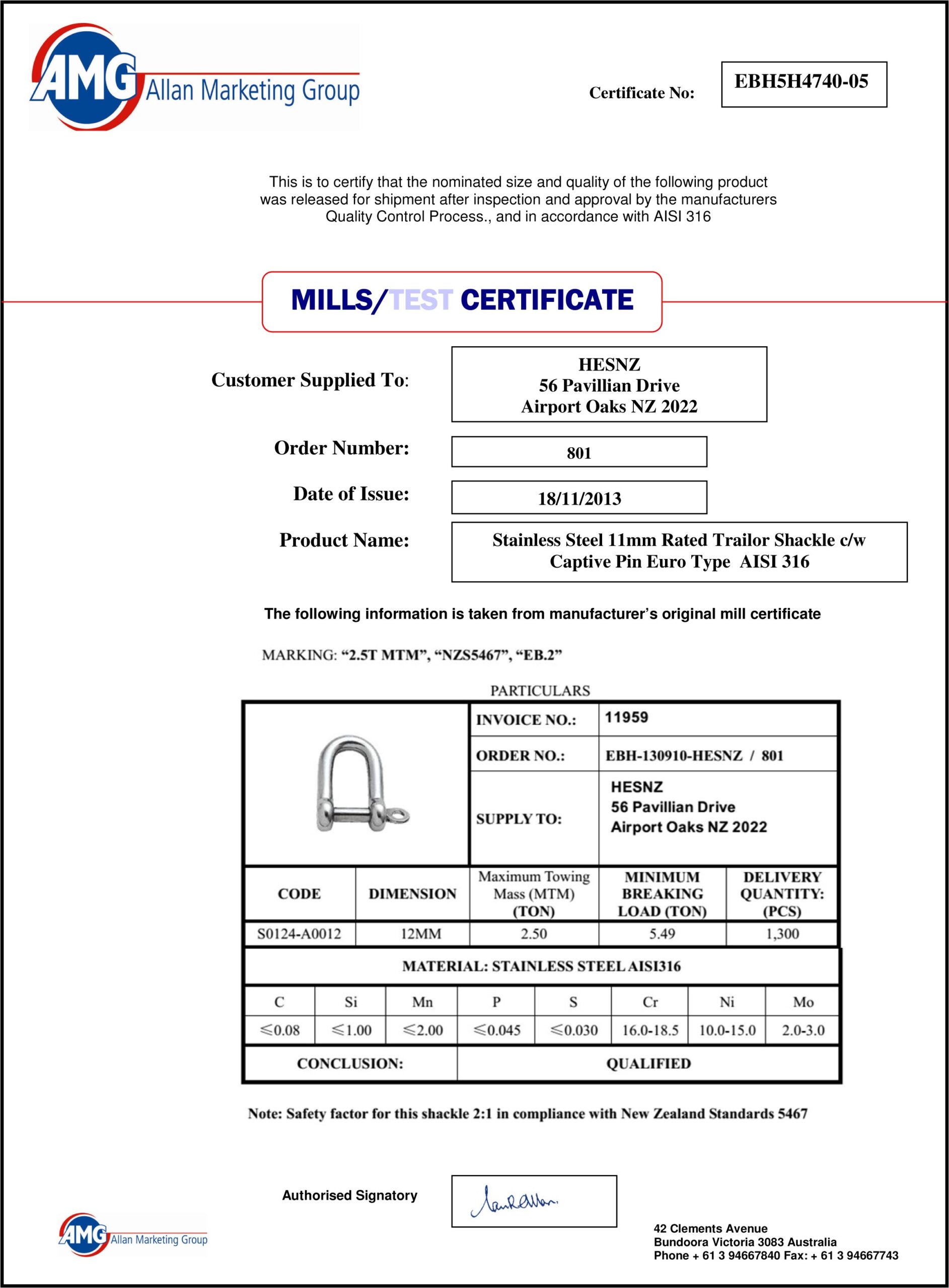 Certificates for Quality AISI316 Stainless Products stocked by HES NZ Ltd