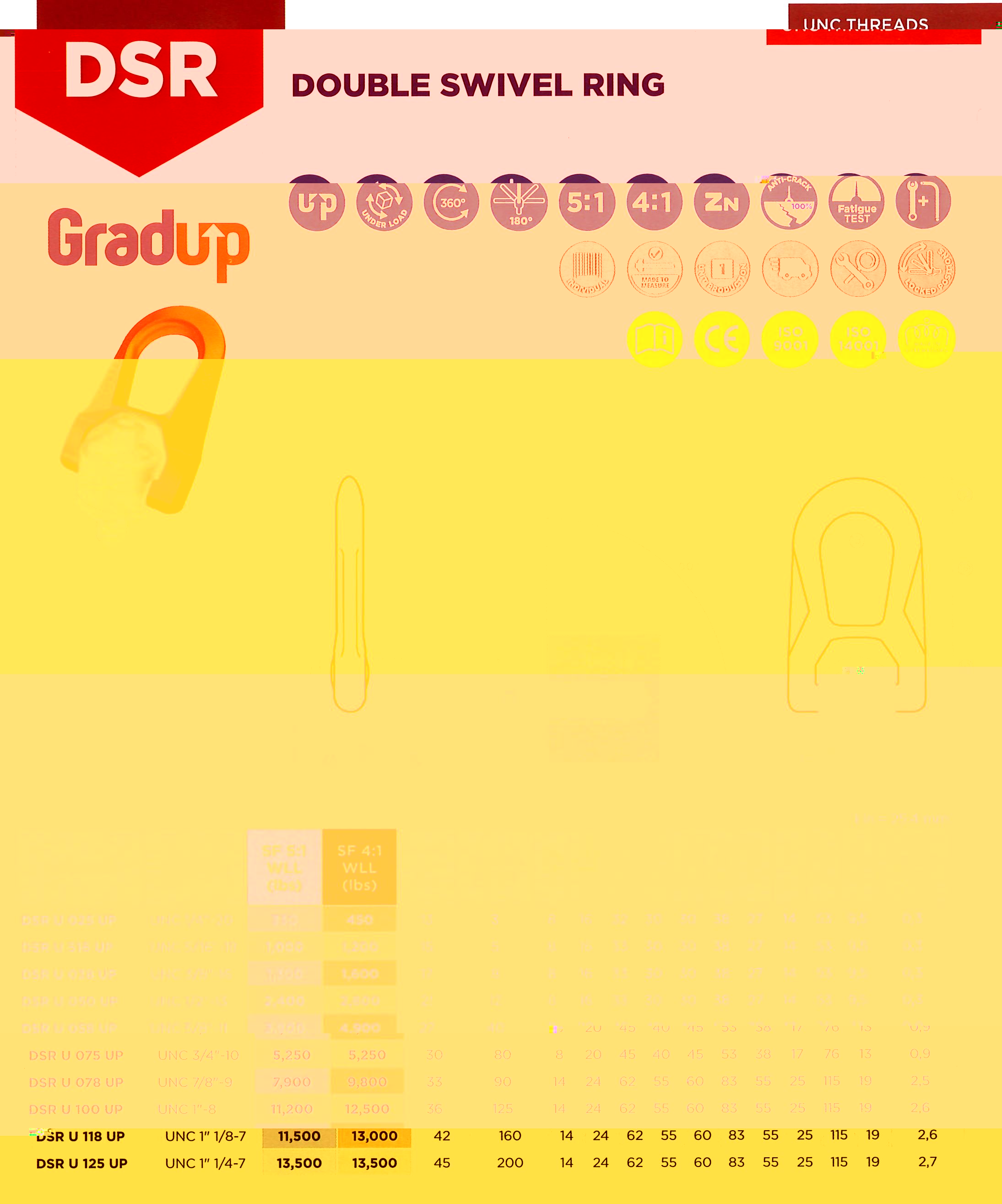 1000lb (454kg) / 5/16"UNC L15mm, 11200lb (5.08T) / 1.0"UNC L36mm, 1300lb (589kg) / 3/8"UNC L17mm, 2400lb (1.08T) / 1/2"UNC L21mm, 330lb (150kg) / 1/4"UNC L13mm, 3900lb (1.76T) / 5/8"UNC L27mm, 5250lb (2.38T) / 3/4"UNC L30mm